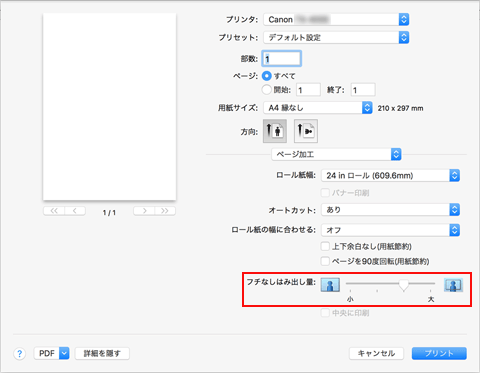 重要- [フチなしはみ出し量]のスライドバーの位置を右端に設定した場合、用紙の裏面が汚れることがあります。
