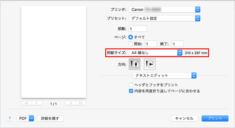 - カスタム用紙サイズを使用してフチなし印刷を行う場合は、[用紙サイズ]の[カスタムサイズを管理...]で[プリントされない領域]の値をすべて0mmに設定したカスタム用紙サイズを作成し、[ページ加工]の[ロール紙の幅に合わせる]で[オン(フチなし)]を選んでください。