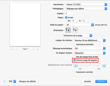 - Lorsque vous sélectionnez un papier au format portrait sous Format papier (Paper Size) dans la boîte de dialogue Imprimer et que la longueur est supérieure à la largeur sélectionnée dans Largeur du rouleau, vous ne pouvez pas utiliser l'option Tourner page 90 degrés.