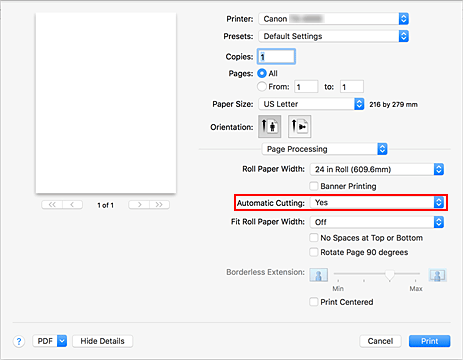 In Taglio automatico (Automatic Cutting), selezionare l'impostazione in base alle proprie esigenze.