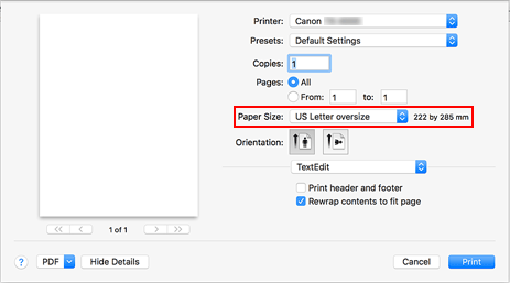 Nella finestra di dialogo Stampa, selezionare "XXX Sovradimensione " per Formato carta (Paper Size).