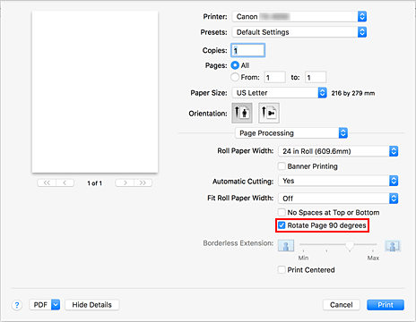 - Quando si seleziona la carta in formato verticale da Formato carta (Paper Size) nella finestra di dialogo Stampa, se la lunghezza è superiore alla larghezza selezionata in Largh. carta in rot. (Roll Paper Width), Ruota pagina di 90 gradi (Rotate Page 90 degrees) non può essere utilizzato.