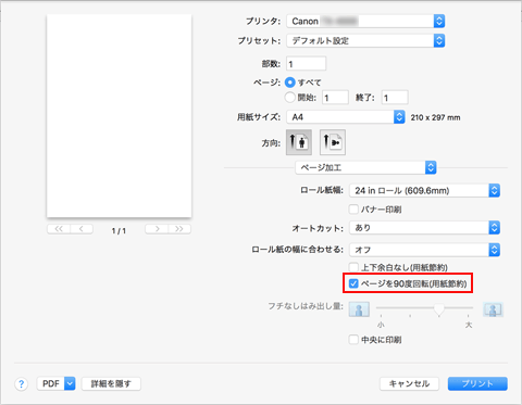 - プリントダイアログの[用紙サイズ]で縦長の用紙を選んでいるとき、縦方向の長さが[ロール紙幅]で選んでいる幅よりも長い場合は、[ページを90度回転(用紙節約)]は使用できません。