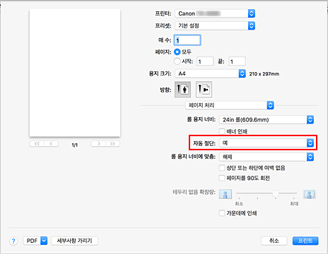 롤 용지를 자동으로 절단하고 절단 안내선을 인쇄하는 절차는 다음과 같습니다.