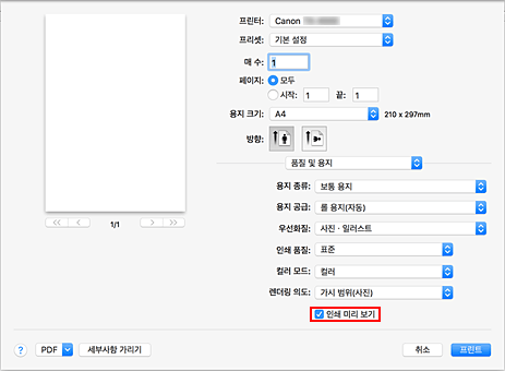 • PDF에서 Canon imagePROGRAF Preview를 선택한 경우에도 인쇄 결과를 표시할 수 있습니다.