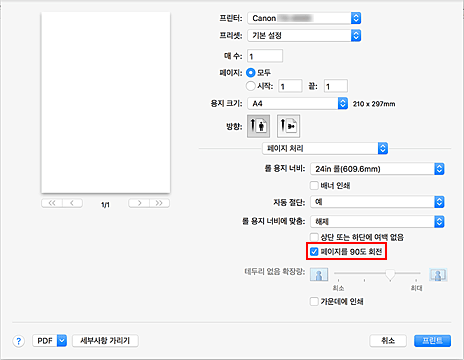 • 프린트 대화 상자의 용지 크기(Paper Size)에서 세로형 용지를 선택한 경우 그 길이가 롤 용지 너비(Roll Paper Width)에서 선택한 너비를 초과하면 페이지를 90도 회전(Rotate Page 90 degrees)을 사용할 수 없습니다.