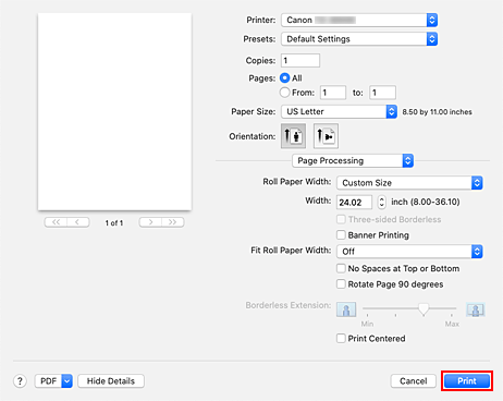 Wählen Sie je nach dem beabsichtigten Zweck Rollenpapier (Auto) (Roll Paper (Auto)), Rolle 1 (Roll 1) oder Rolle 2 (Roll 2) für die Papierzufuhr (Paper Source).