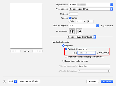 Si vous saisissez le code PIN que vous avez défini sur le panneau de contrôle de l'imprimante, la tâche d'impression sera imprimée.