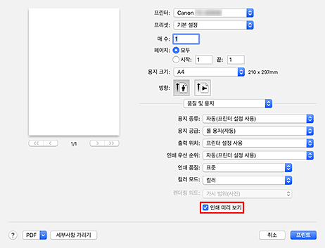 - PDF에서 Canon imagePROGRAF Preview를 선택한 경우에도 인쇄 결과를 표시할 수 있습니다.