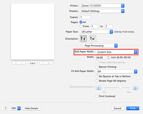Selecione Tam. pers. (Custom Size) para Larg. papel em rolo (Roll Paper Width).