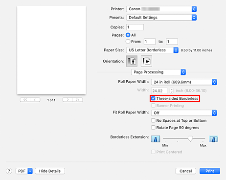 Установите флажок напротив пункта Трехсторонняя печать без полей (Three-sided Borderless)