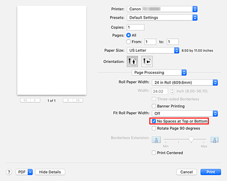 Выберите Рулон бумаги (Авто) (Roll Paper (Auto)), Рулон 1 (Roll 1) или Рулон 2 (Roll 2) для параметра Источник бумаги (Paper Source) в зависимости от ваших целей.