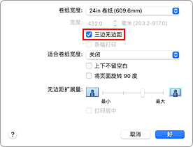 使用三面无边距打印功能,如果纸张尺寸与卷纸宽度不匹配,则可以在三面执行无边距打印。