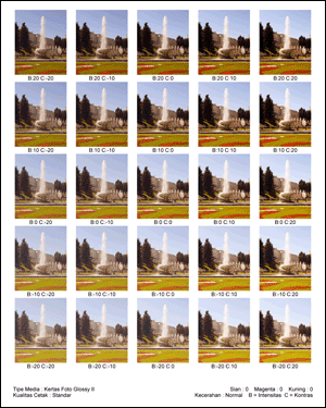 Lihat hasil cetakan dan pilih gambar yang paling Anda suka. Kemudian masukkan angka intensitas/kontras yang ditunjukkan di bagian bawah gambar ke dalam kolom Intensitas(Intensity) dan Kontras(Contrast) pada tab Pengaturan Warna(Color Adjustment).