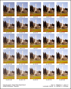 Examinez les résultats d'impression et sélectionnez votre image favorite. Entrez ensuite les chiffres relatifs à l'intensité/au contraste situés en bas de cette image dans les champs Intensité et Contraste de l'onglet Réglage des couleurs.