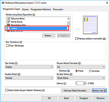 Pilih Amplop(Envelope) dari Setelan yang Biasa Digunakan(Commonly Used Settings) pada tab Pengesetan Cepat(Quick Setup).