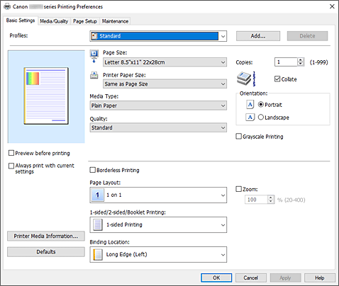 Anda juga dapat mengubah profil pencetakan dan mendaftarkannya dengan nama baru. Anda dapat menghapus profil pencetakan yang terdaftar.- Standar(Standard)