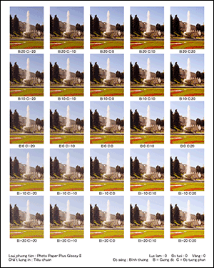 Xem các kết quả in và chọn hình ảnh mà bạn thích nhất. Sau đó nhập các giá trị cường độ/độ tương phản được biểu thị ở phía dưới của hình ảnh vào các trường Cường độ(Intensity) và Độ tương phản(Contrast) trên tab Điều chỉnh màu(Color Adjustment).