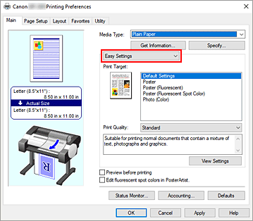 Wählen Sie im Pull-Down-Menü die Option Einfache Einstellungen (Easy Settings) aus, und wählen Sie dann aus der Liste Druckziel (Print Target) die Einstellung aus, die Ihrem Zweck am besten entspricht.