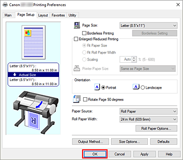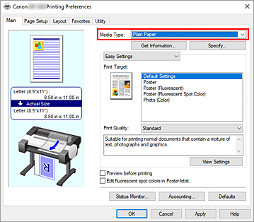 Die aktuellen Druckereinstellungen werden unter Medientyp (Media Type) und Rollenpapierbreite (Roll Paper Width) angezeigt.Übernehmen Sie die Einstellungen.