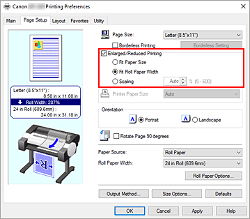 Aktivieren Sie Druck mit Vergrößerung/Verkleinerung (Enlarged/Reduced Printing), und wählen Sie Anp.an Rollenp.-Br. (Fit Roll Paper Width) aus.