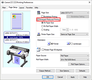 Aktivieren Sie das Kontrollkästchen Druck mit Vergrößerung/Verkleinerung (Enlarged/Reduced Printing).