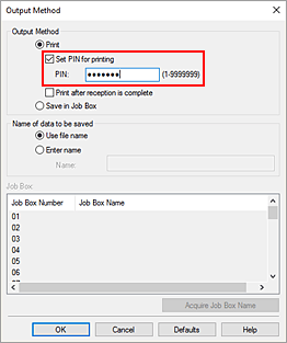 Mettere un segno di spunta accanto a Imposta PIN per stampa (Set PIN for printing) e immettere un numero da una a sette cifre in PIN.