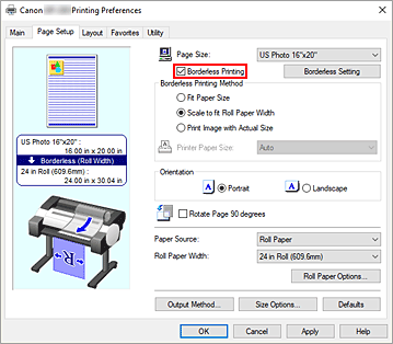 - 테두리 없는 인쇄(Borderless Printing) 옵션 옆의 확인란을 선택한 경우 레이아웃(Layout) 탭의 페이지 레이아웃(Page Layout) 및 가운데에 인쇄(Print Centered) 옵션은 회색으로 표시되고 구성할 수 없습니다.