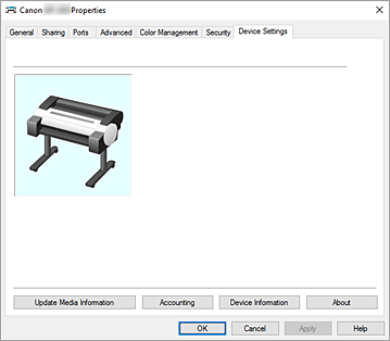 Você pode obter as informações do dispositivo da impressora conectada e alterar a configuração de acordo com a impressora que está conectada à função do driver. - Sobre (About)