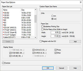 Para estreitar os tamanhos de papel exibidos em Lista de tamanhos de papel (Paper Size List), marque a caixa de seleção Exibir séries (Display Series).