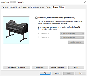 - Haga clic en Obtener información... (Get Information...) en la pestaña Configuración de dispositivo (Device Settings) para obtener información sobre el ancho del rollo de papel. Si no ha establecido correctamente la anchura del rollo de papel, es posible que no pueda imprimir correctamente.