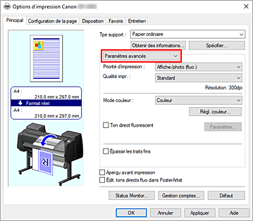 Dans la liste Format page de l'onglet Configuration de la page, sélectionnez le même format que celui du document créé avec le logiciel d'application.