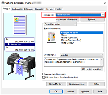 Sélectionnez le type du papier chargé dans l'imprimante dans la liste Tpe support de l'onglet Principal.