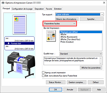 Dans le menu déroulant, sélectionnez Paramètres faciles, puis sélectionnez le paramètre correspondant à vos besoins dans la liste But de l'impression.