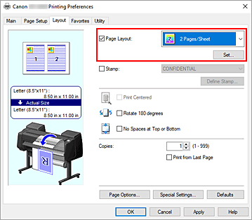 Nella scheda Layout, selezionare la casella di controllo Layout di pagina (Page Layout) e, dal menu a discesa, selezionare 2 pagine/foglio (2 Pages/Sheet), 4 pagine/foglio (4 Pages/Sheet), 6 pagine/foglio (6 Pages/Sheet), 8 pagine/foglio (8 Pages/Sheet), 9 pagine/foglio (9 Pages/Sheet) oppure 16 pagine/foglio (16 Pages/Sheet).