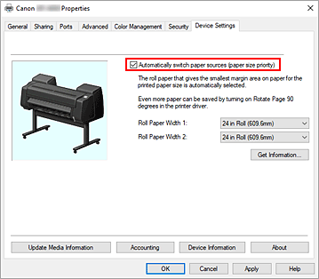 참고- 급지 방법 자동 전환(용기 크기 우선)(Automatically switch paper sources (paper size priority))이 회색으로 표시되는 경우, "롤 용지 유닛 설정을 프린터 드라이버에 반영하기"를 참조하여 장치 정보(Device Information) 대화 상자에서 롤 용지 유닛(Roll Unit)을 예(Yes)로 설정하십시오.