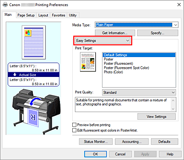 No menu suspenso, selecione Configurações fáceis (Easy Settings), depois escolha a configuração de sua preferência na lista Destino de impressão (Print Target).