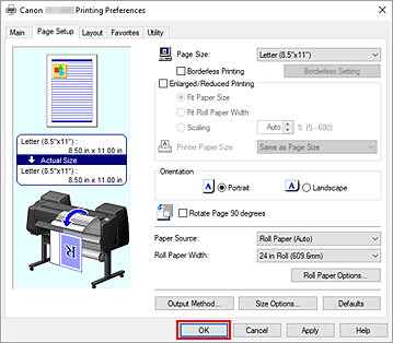 Se você selecionou papel em rolo para Origem do papel (Paper Source), defina Larg. papel em rolo (Roll Paper Width) como a largura do papel em rolo carregado na impressora.