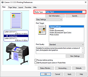 Selecione o tipo de papel da impressora na lista Tipo de Mídia (Media Type) da guia Principal (Main).