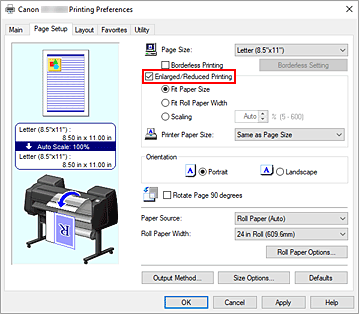 - Se você estiver realizando impressões ampliadas/reduzidas quando Alternar origs. de papel automatic. (prioridade de tam. do papel) (Automatically switch paper sources (paper size priority)) na guia Configurações de dispositivo (Device Settings) estiver ativado, Aj. larg. papel rolo (Fit Roll Paper Width) será selecionado para Impressão ampliada/reduzida (Enlarged/Reduced Printing) na guia Configurar página (Page Setup), e Papel em rolo (auto.) (Roll Paper (Auto)) será selecionado para Origem do papel (Paper Source), o Rolo 1 (papel em rolo de nível superior) será sempre usado para impressão.