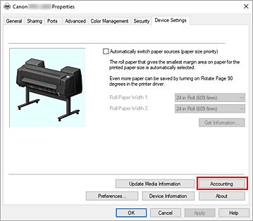 Configuración de la información de contabilidad desde Propiedades de la impresora (Printer properties)