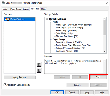 Puede registrar las opciones de impresión utilizadas más habitualmente en Favoritos (Favorites). En cualquier momento se pueden borrar los perfiles de impresión innecesarios.