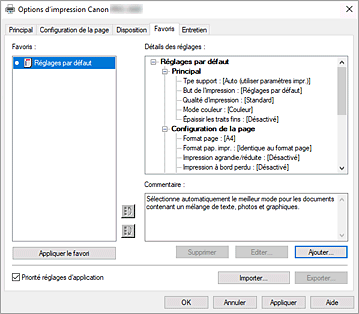 L'onglet Favoris vous permet d'enregistrer les paramètres d'impression les plus fréquemment utilisés en tant que favoris.