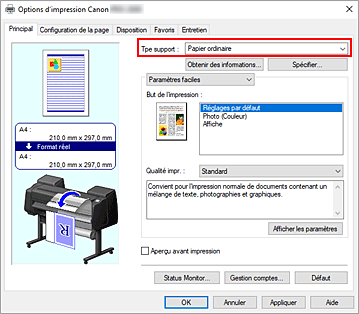 Remarque- Pour empêcher l'imprimante d'appliquer automatiquement le type de support défini sur l'imprimante, modifiez les paramètres dans Param. personnalisés... dans l'onglet Entretien.