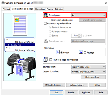 Dans la liste Format page de l'onglet Configuration de la page, sélectionnez le même format que celui du document créé avec le logiciel d'application.