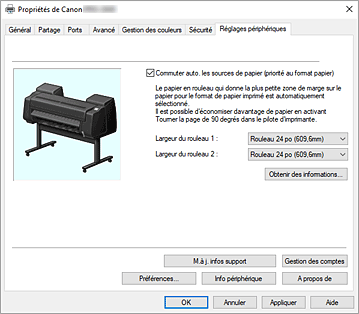Important- Lorsque vous remplacez le rouleau de papier chargé dans l'imprimante, cliquez toujours sur Obtenir des informations... pour obtenir les informations relatives à la largeur du rouleau. Si la largeur du rouleau n'est pas définie correctement, il est possible que vous ne puissiez pas imprimer le document comme vous le souhaitez.