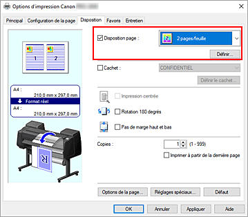 Important- Lorsqu'une coche figure en regard de Impression bannière dans la boîte de dialogue Options rouleau de l'onglet Configuration de la page, l'option Disposition page est grisée et ne peut pas être sélectionnée.
