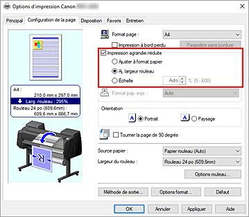 Cochez la case Impression agrandie/réduite et sélectionnez Aj. largeur rouleau.