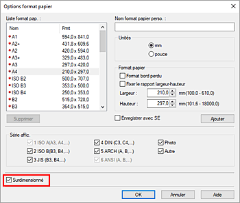 - Pour définir un format papier surdimensionné pour un format papier non standard, enregistrez le format papier dans la boîte de dialogue Options format papier. Il n'est pas possible de définir un format papier surdimensionné pour les formats papier préalablement définis dans la boîte de dialogue Réglages de format personnalisé.