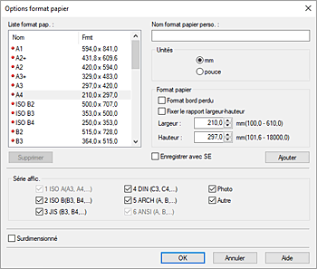 Pour limiter le nombre des formats papier affichés dans Liste format pap., cochez la case Série affic..